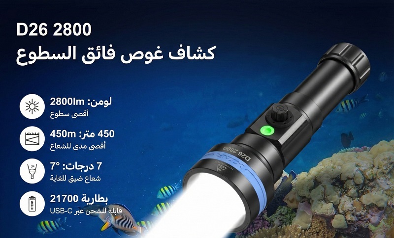 بيلة الغوص XTAR D26 2800 مصممة لتقديم أداء احترافي واعتمادية عالية تحت الماء،