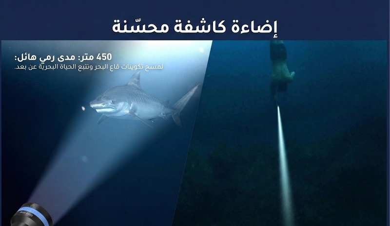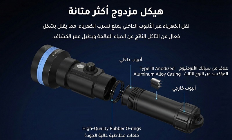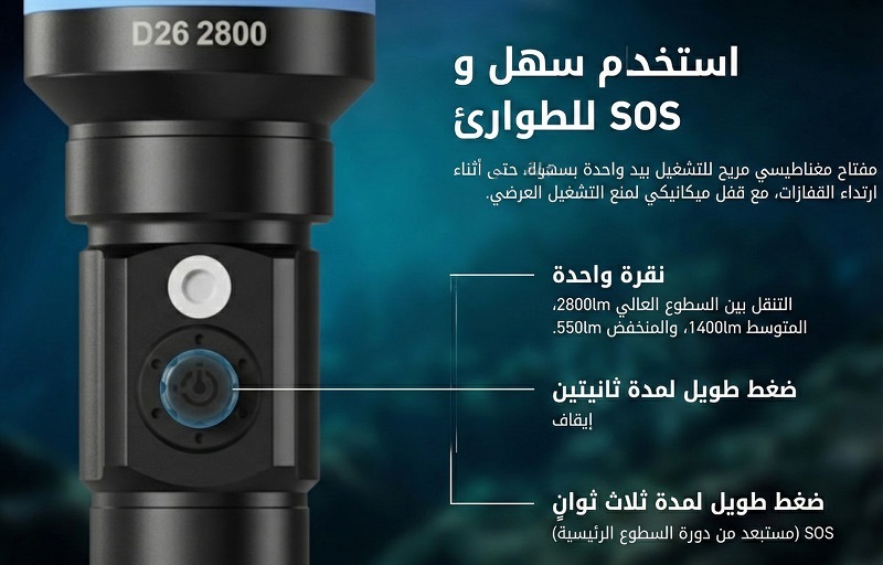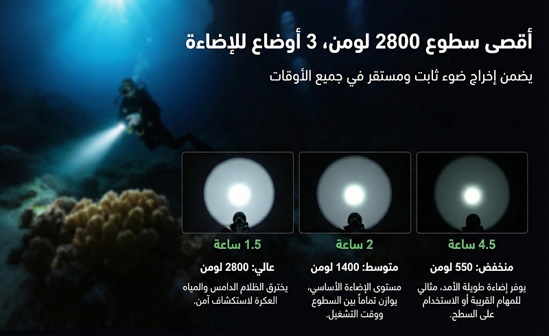 حيث توفر إضاءة قوية وثابتة بقدرة 2800 لومن تمنح رؤية واضحة في مختلف ظروف الغوص.