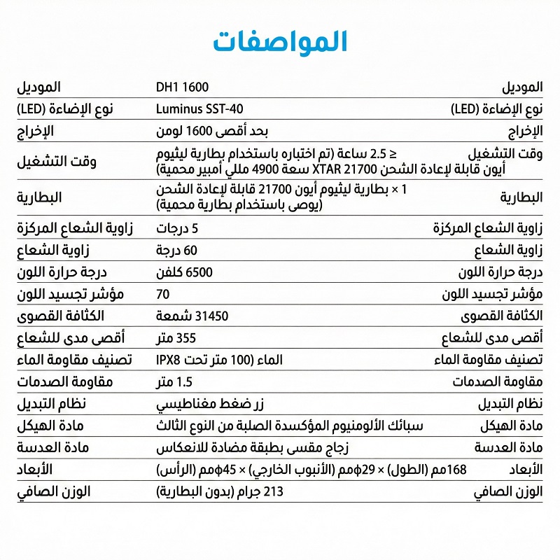 إذا كنت تبحث عن مصباح يجمع بين الجودة، القوة، والاعتمادية من شركة معروفة بخبرتها في أنظمة الإضاءة والبطاريات، فإن XTAR DH1 1600 يعتبر خيارًا عمليًا يلبي احتياجاتك بكفاءة.